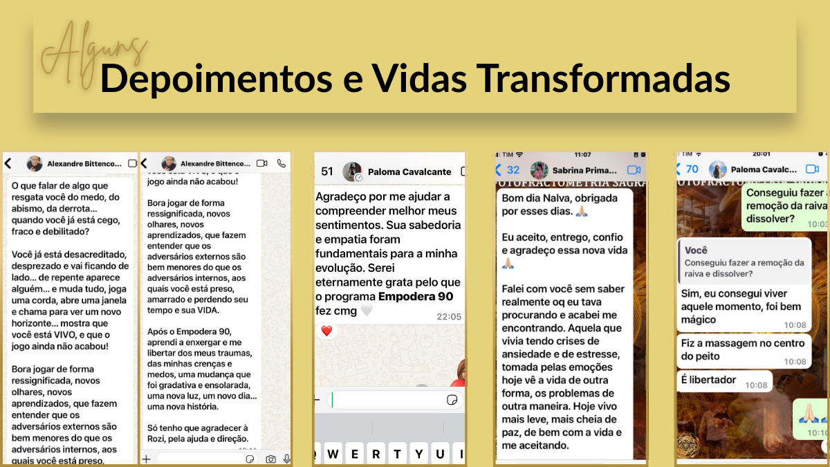 Por isso, o Empodera90 promove a cura emocional, limpando o campo vibracional e elevando a energia da pessoa para que ela possa atrair e criar tudo de melhor para sua vida. Quando há paz interior, o resto flui naturalmente.